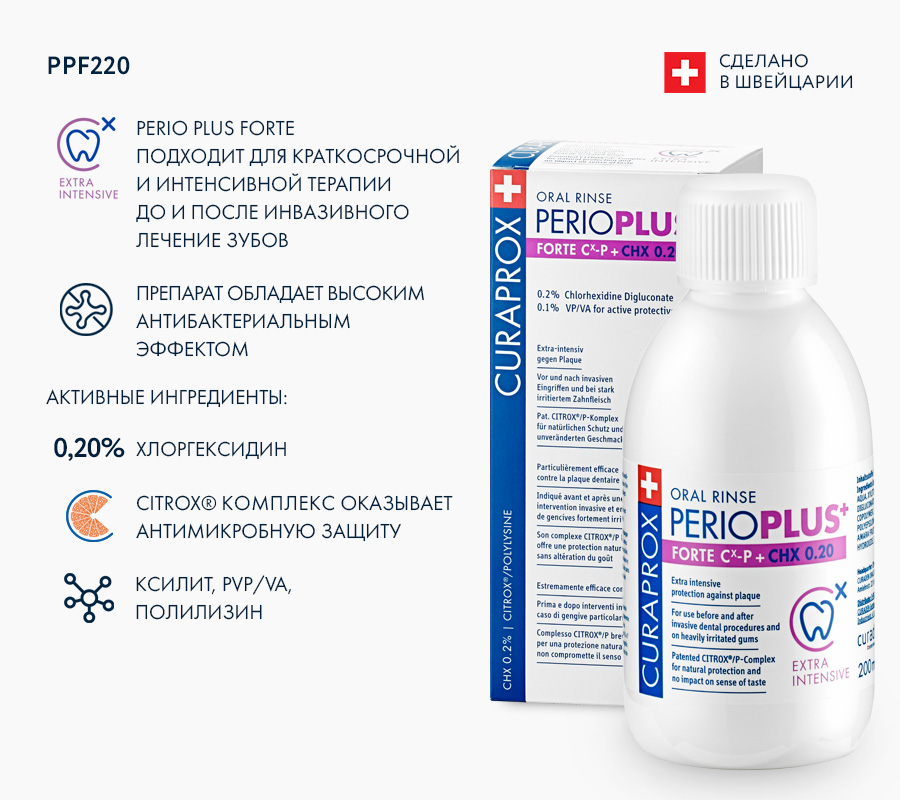 Уникальный продукт будущего по борьбе с бактериальным зубным налетом, а также оказанию лечебного и профилактического действия благодаря запатентованной комбинации хлоргексидина и CITROX-комплекса.