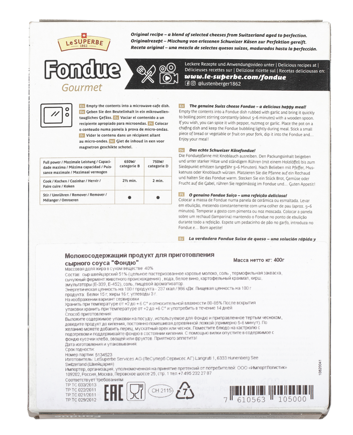 Сырное фондю «Le Superb» создано специально для моментов, когда хочется ненадолго вырваться из повседневного шума и суеты, собраться с друзьями и приятно провести вечер. Нежное, деликатное и пикантное фондю с пряным вкусом, создано специально для приготовления неповторимого швейцарского фондю. В составе - только натуральные ингредиенты: швейцарский сыр, приготовленный из отборного молока, которое дают коровы, питающиеся сочными травами альпийских лугов, с добавлением белого вина, вишнёвой настойки, и соли. Настоящий кусочек Швейцарии с традицией, которая берет свои истоки в 17 веке.