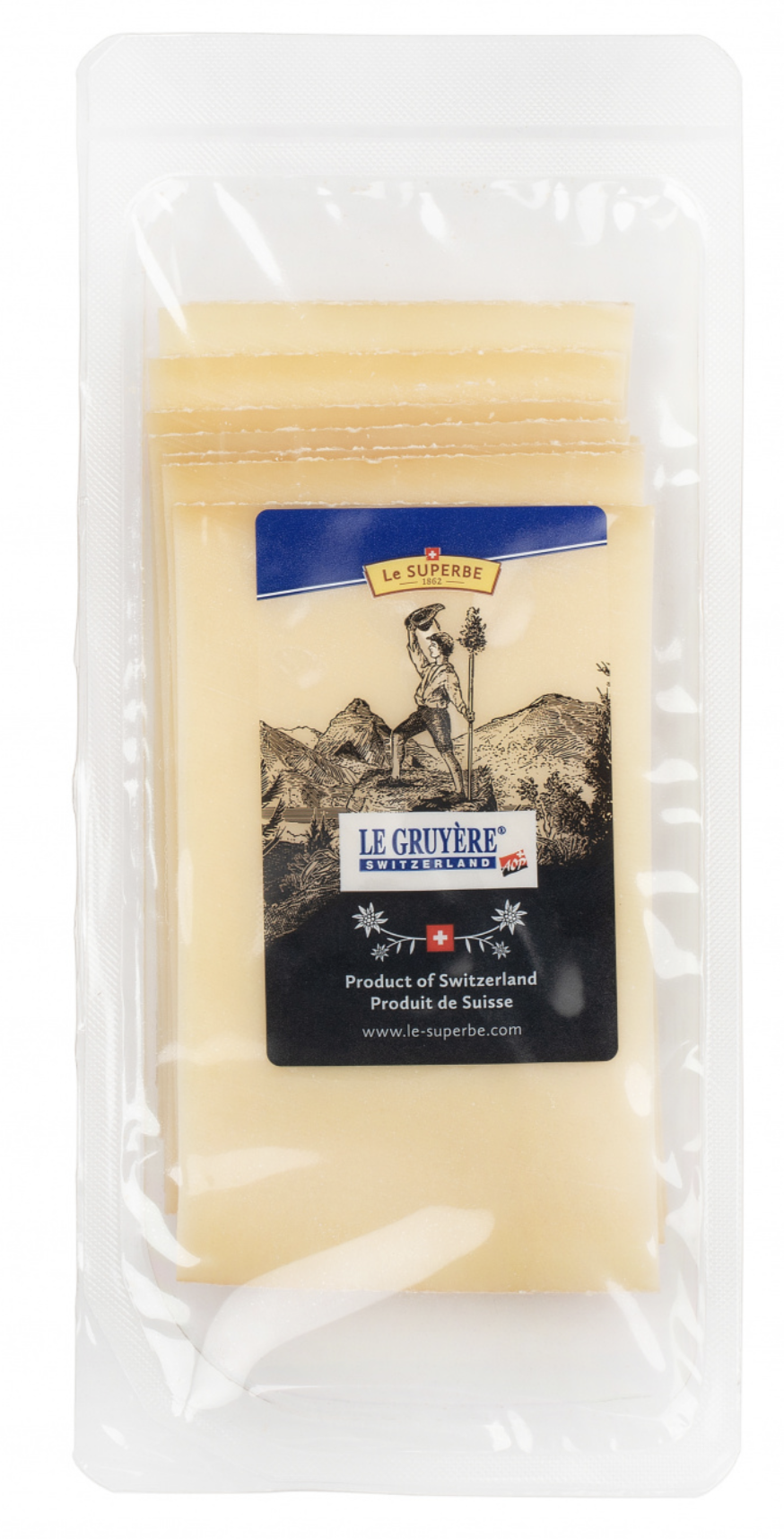 Le Gruyère AOP – твердый сыр цвета слоновой кости, с небольшими дырочками. Отличается фруктовым, слегка солоноватым вкусом (в процессе созревания головки Грюйера периодически переворачивают и обмывают соленой водой). Период созревания 5 месяцев. Грюйер – главный компонент фондю, но кроме этого, он очень вкусен на тостах, в слегка расплавленном виде.