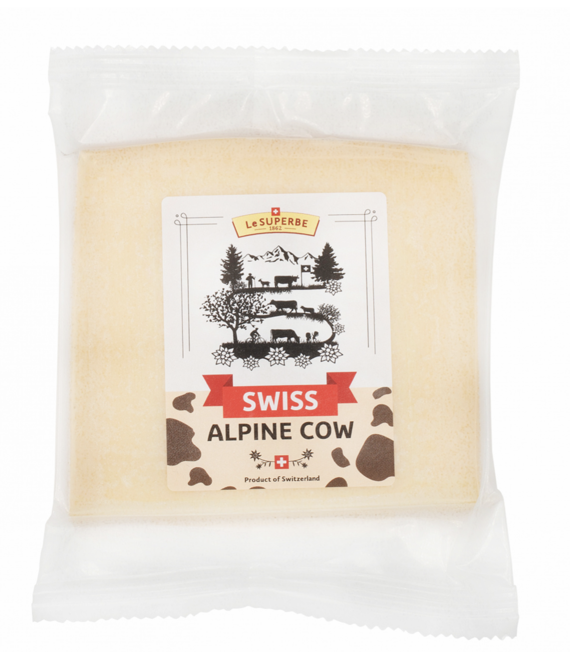 консервантов. Сыр LeSuperbe Swiss Alpine Cow напоминает о бескрайних зеленых лугах, на которых пасутся швейцарские коровы, и которые ярко освещает солнце. Вы уже слышите звон колокольчиков местных коров? Сыр LeSuperbe Swiss Alpine Cow - настоящая легенда из Швейцарии!